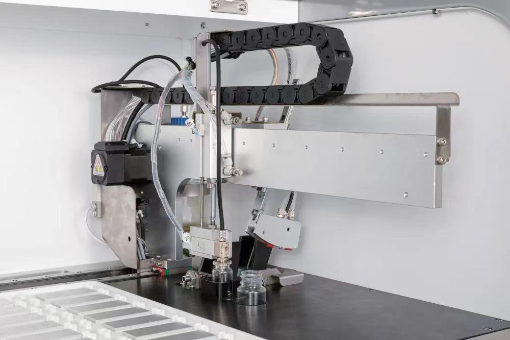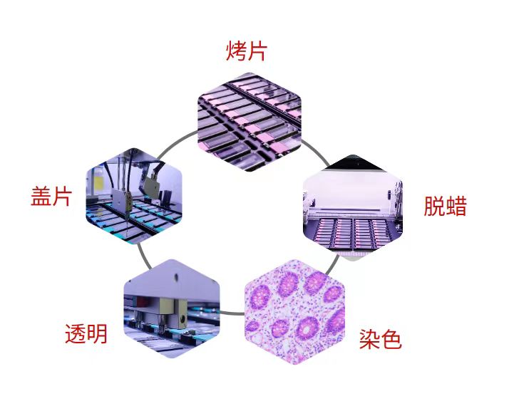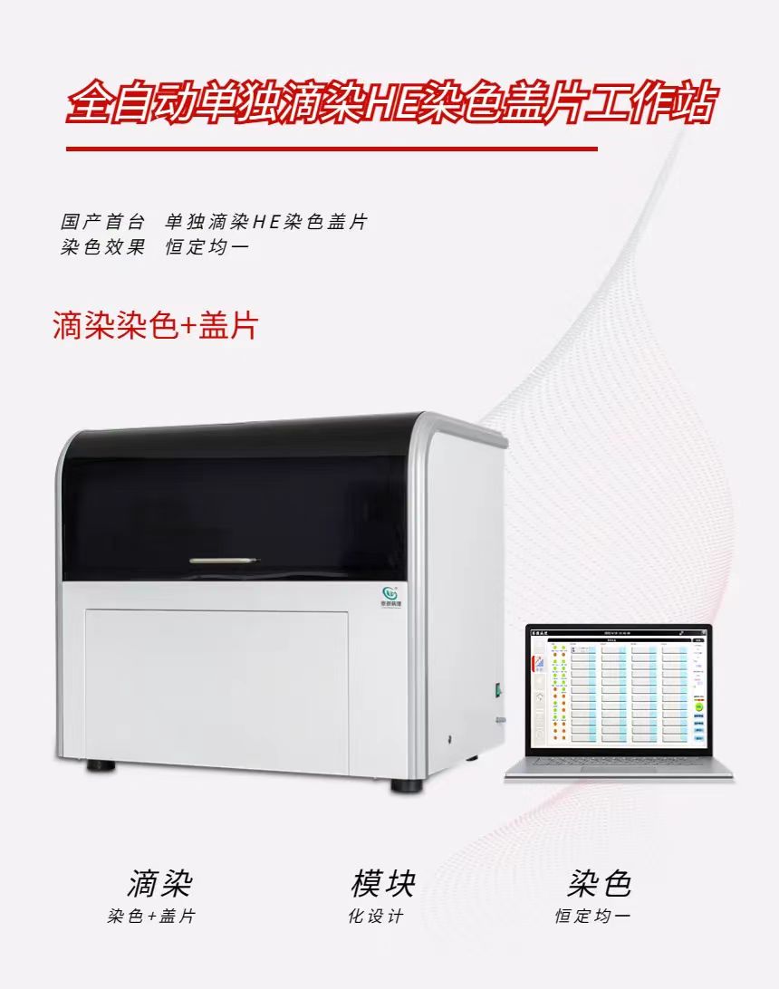 全自动单独滴染HE染色盖片工作站是一款将烤片、脱蜡、染色、透明、盖片集成于同一台设备的全自动流水线,采用滴染方式染色,避免标本间的交叉污染,同时保证每张玻片所用染液均为新鲜试剂,确保染色效果恒定均一。